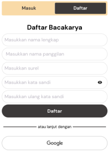 - Setelah itu, jika kamu belum mendaftar klik daftar, lalu isi form dan klik “daftar”. Kamu juga bisa menggunakan akun Google untuk mendaftarkan akun. Namun, apabila sebelumnya kamu sudah mendaftar kamu bisa masuk langsung menggunakan akunmu.